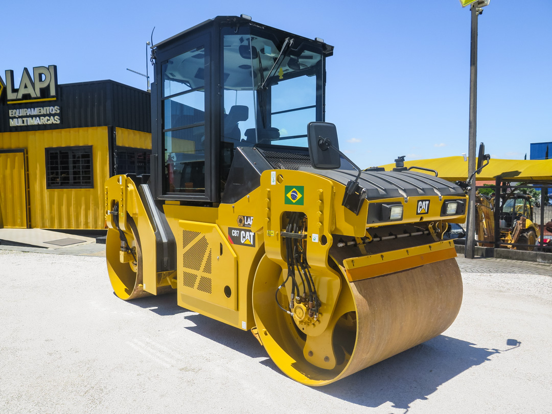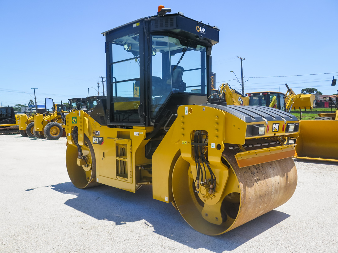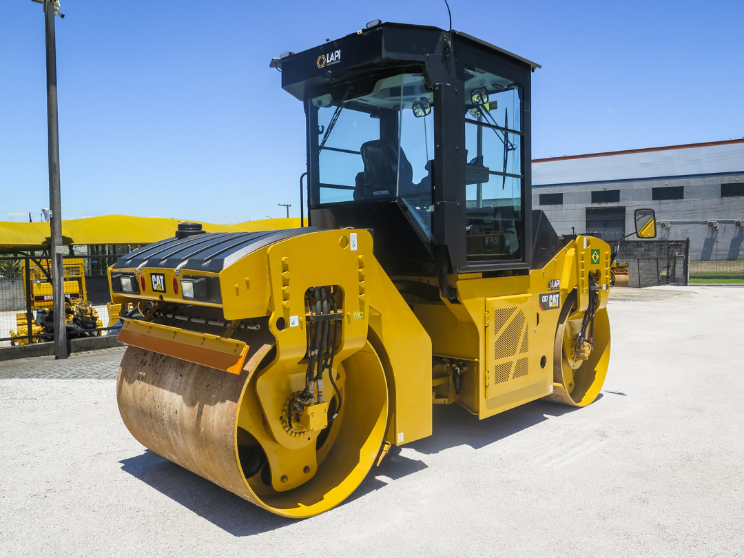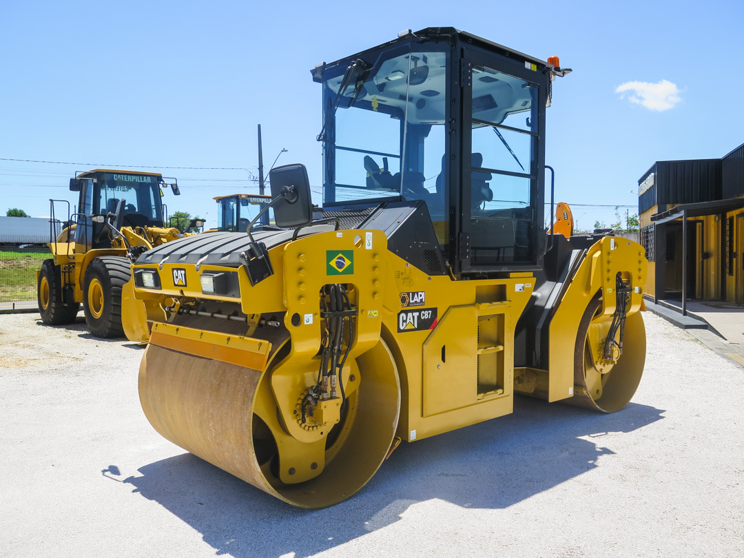 Rolo Compactador Caterpillar CB7 ano 2020, com 3.800 horas de uso, revisado e pronto para trabalhar. Equipado com motor Cat C3.4B de 100 hp e peso operacional de 9.330 kg. Rolo tandem ideal para pavimentação.